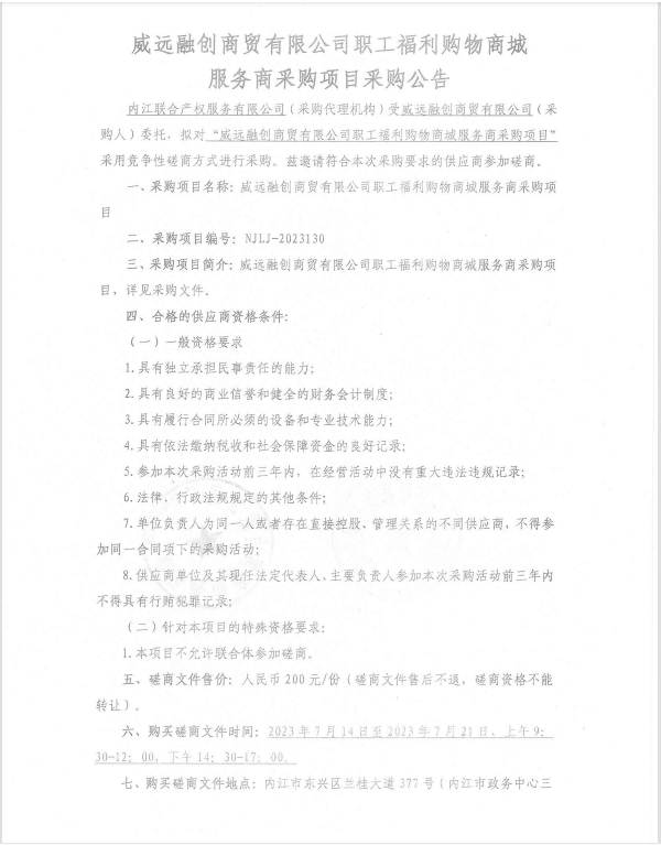 威遠(yuǎn)融創(chuàng)商貿(mào)有限公司職工福利購(gòu)物商城服務(wù)商采購(gòu)項(xiàng)目采購(gòu)公告