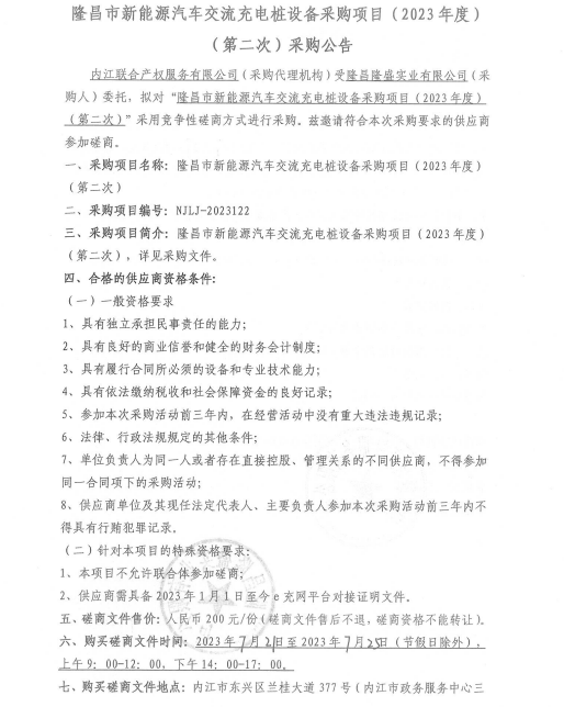 隆昌市新能源汽車交流充電樁設備采購項目(2023年度) (第二次)采購公告