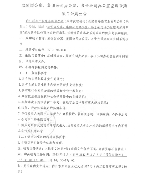 雙創(chuàng)園公寓、集團(tuán)公司辦公室、各子公司辦公室空調(diào)采購項(xiàng)目采購公告