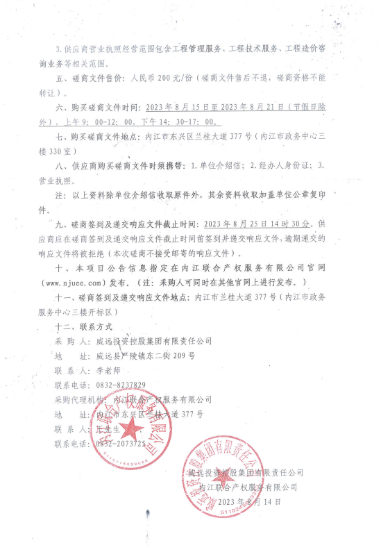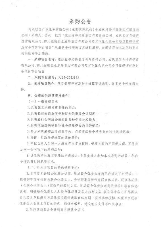 威遠(yuǎn)投資控股集團(tuán)有限責(zé)任公司、威遠(yuǎn)縣國有資產(chǎn)經(jīng)營有限公司、四川振威實業(yè)發(fā)展集團(tuán)有限公司及其下屬六家公司項目管理評審及財務(wù)核算審計項目采購公告
