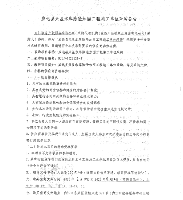 威遠縣天星水庫除險加固工程施工單位采購公告