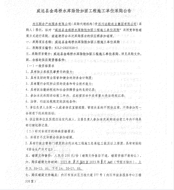 威遠(yuǎn)縣金雞橋水庫除險加固工程施工單位采購公告