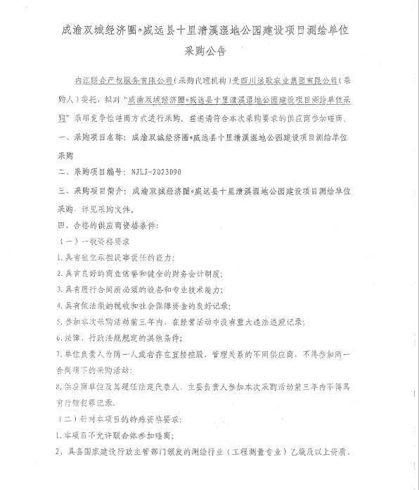 成渝雙城經(jīng)濟圈?威遠縣十里清溪濕地公園建設(shè)項目測繪單位采購公告