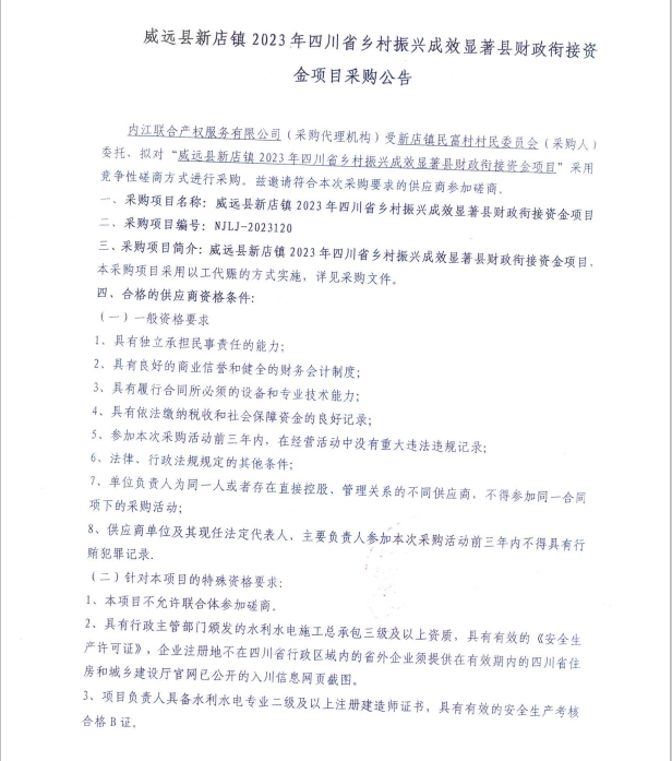 威遠(yuǎn)縣新店鎮(zhèn)2023年四川省鄉(xiāng)村振興成效顯著縣財(cái)政銜接資金項(xiàng)目采購公告