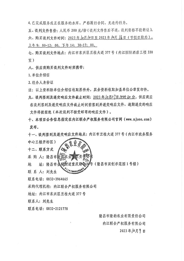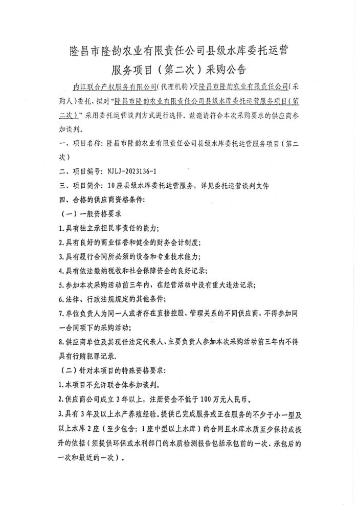 隆昌市隆韻農(nóng)業(yè)有限責(zé)任公司縣級水庫委托運(yùn)營服務(wù)項目(第二次)采購公告