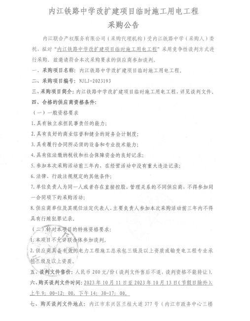 內(nèi)江鐵路中學(xué)改擴(kuò)建項(xiàng)目臨時(shí)施工用電工程采購(gòu)公告