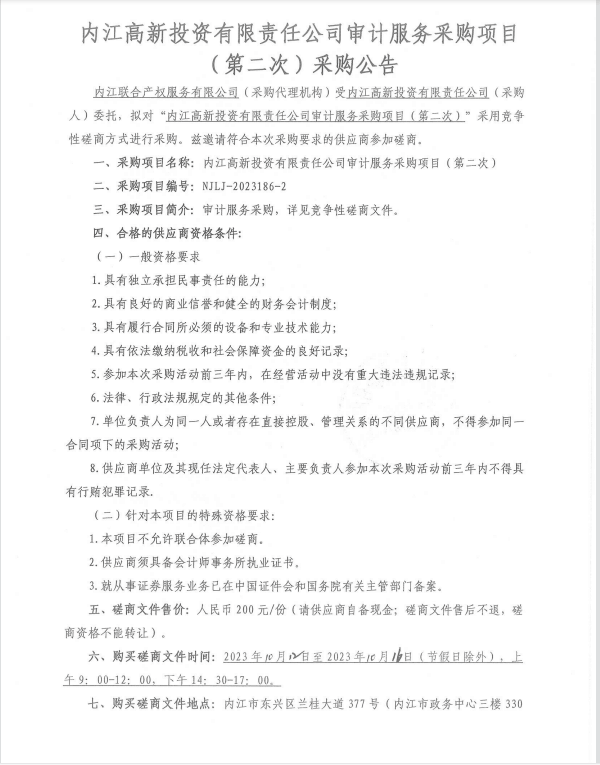 內(nèi)江高新投資有限責任公司審計服務采購項目(第二次)采購公告