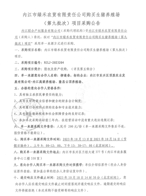 內(nèi)江市綠禾農(nóng)貿(mào)有限責(zé)任公司購買生豬養(yǎng)殖場(第九批次)項目采購公告