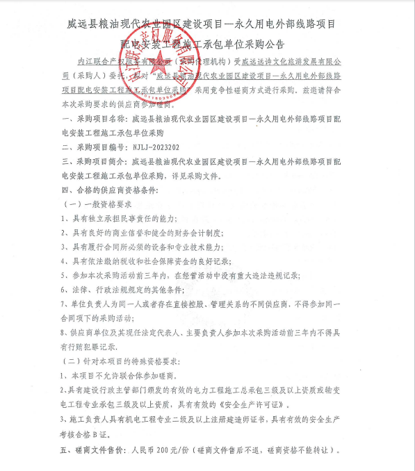 威遠(yuǎn)縣糧油現(xiàn)代農(nóng)業(yè)園區(qū)建設(shè)項(xiàng)目—永久用電外部線路項(xiàng)目配電安裝工程施工承包單位采購公告