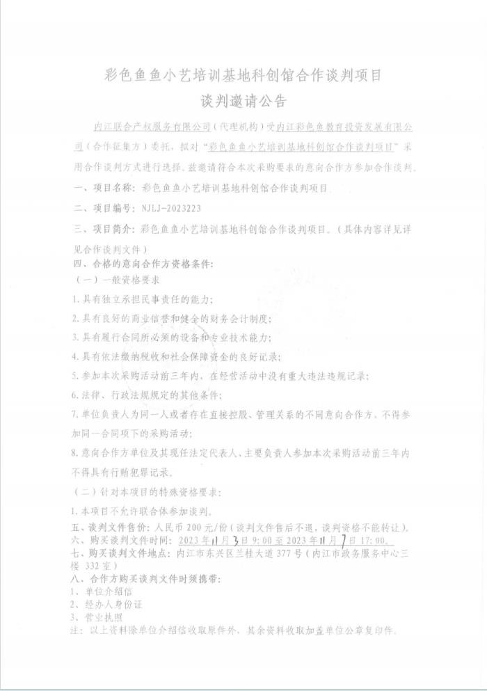 彩色魚(yú)魚(yú)小藝培訓(xùn)基地科創(chuàng)館合作談判項(xiàng)目采購(gòu)公告