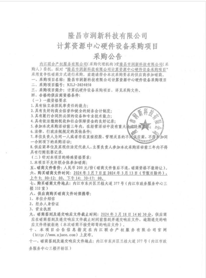 隆昌市潤(rùn)新科技有限公司計(jì)算資源中心硬件設(shè)備采購項(xiàng)目采購公告