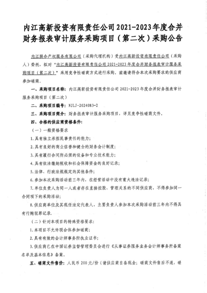 內(nèi)江高新投資有限責(zé)任公司2021-2023年度合并財(cái)務(wù)報(bào)表審計(jì)服務(wù)采購項(xiàng)目(第二次)采購公告