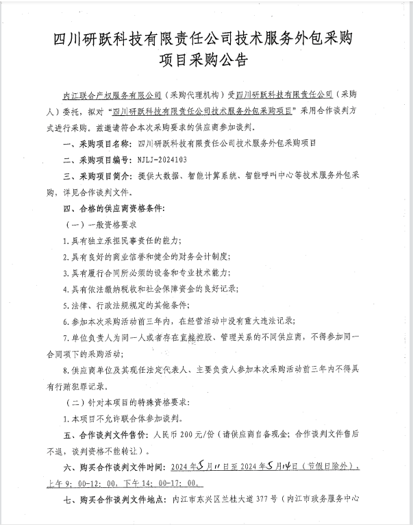 四川研躍科技有限責(zé)任公司技術(shù)服務(wù)外包采購項目采購公告