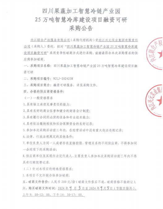 四川果蔬加工智慧冷鏈產(chǎn)業(yè)園25萬噸智慧冷庫建設(shè)項目融資可研采購公告