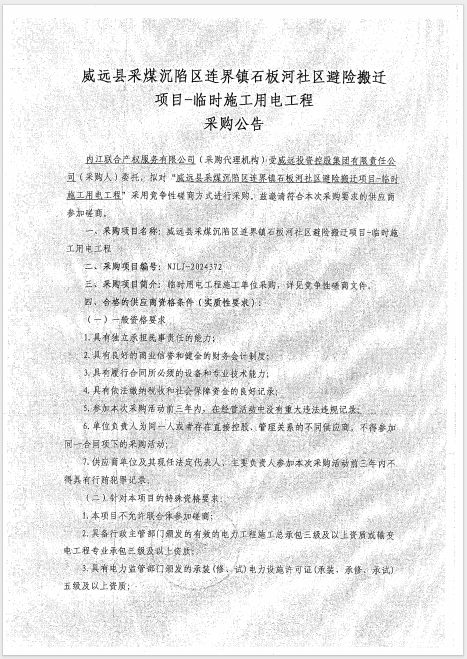 威遠(yuǎn)縣采煤沉陷區(qū)連界鎮(zhèn)石板河社區(qū)避險搬遷 項(xiàng)目-臨時施工用電工程采購公告