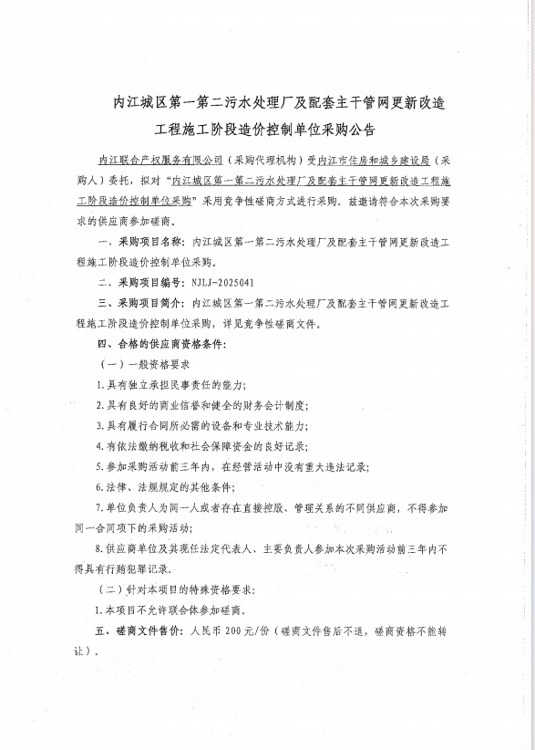 內(nèi)江城區(qū)第一第二污水處理廠及配套主干管網(wǎng)更新改造工程施工階段造價(jià)控制單位采購公告