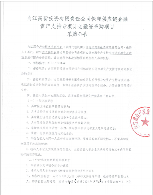 內(nèi)江高新投資有限責(zé)任公司保理供應(yīng)鏈金融資產(chǎn)支持專項(xiàng)計(jì)劃融資采購(gòu)項(xiàng)目采購(gòu)公告