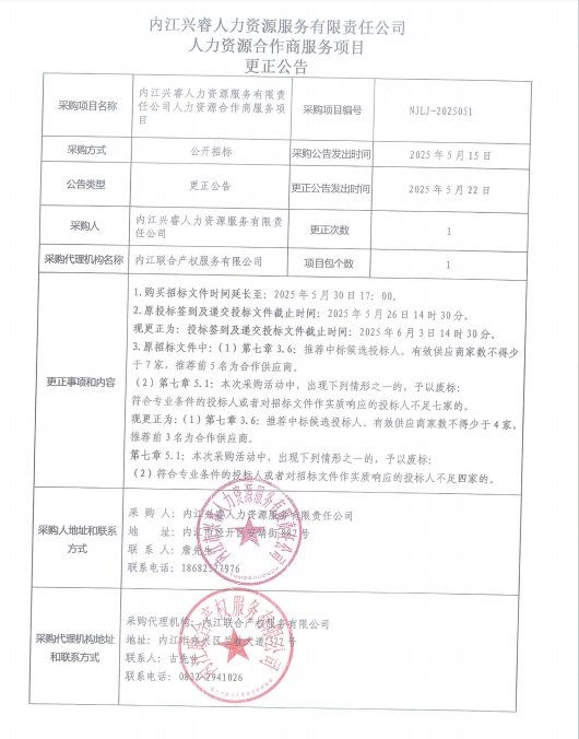 內(nèi)江興睿人力資源服務(wù)有限責(zé)任公司人力資源合作商服務(wù)項(xiàng)目更正公告