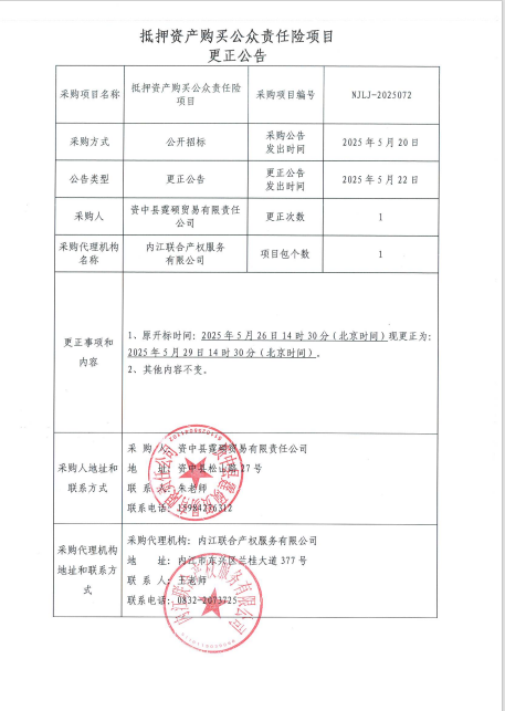 抵押資產(chǎn)購買公眾責任險項目-更正公告
