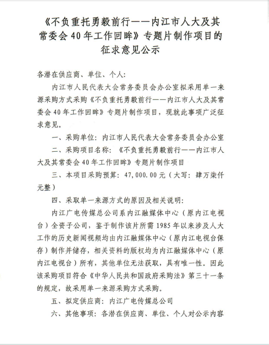 《不負(fù)重托勇毅前行——內(nèi)江市人大及其常委會(huì)40年工作回眸》專題片制作項(xiàng)目的征求意見公示