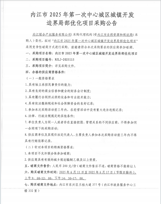 內(nèi)江市2025年第一次中心城區(qū)城鎮(zhèn)開(kāi)發(fā)邊界局部?jī)?yōu)化項(xiàng)目采購(gòu)公告