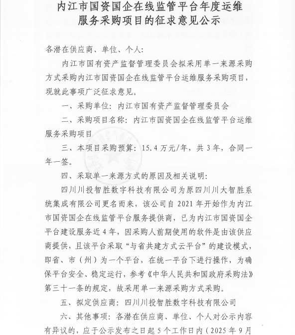 內(nèi)江市國(guó)資國(guó)企在線監(jiān)管平臺(tái)運(yùn)維服務(wù)采購(gòu)項(xiàng)目的征求意見公示