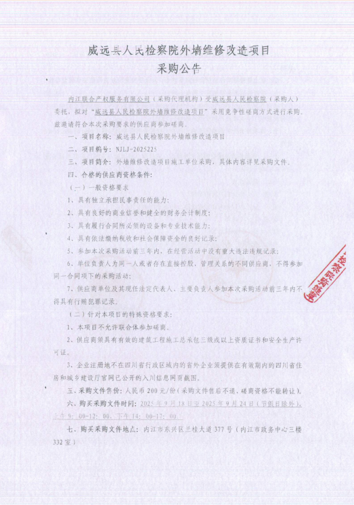 威遠(yuǎn)縣人民檢察院外墻維修改造項(xiàng)目采購公告