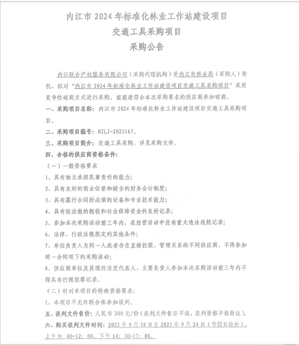 內(nèi)江市2024年標(biāo)準(zhǔn)化林業(yè)工作站建設(shè)項(xiàng)目交通工具采購項(xiàng)目采購公告