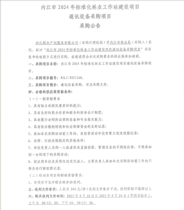 內(nèi)江市2024年標準化林業(yè)工作站建設項目通訊設備采購項目采購公告