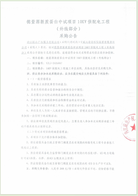 德量源新質蛋白中試項目10KV供配電工程(外線部分)采購公告