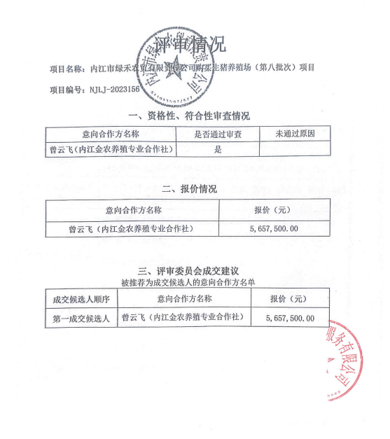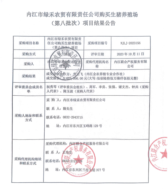 內(nèi)江市綠禾農(nóng)貿(mào)有限責(zé)任公司購買生豬養(yǎng)殖場(第八批次)項(xiàng)目結(jié)果公告