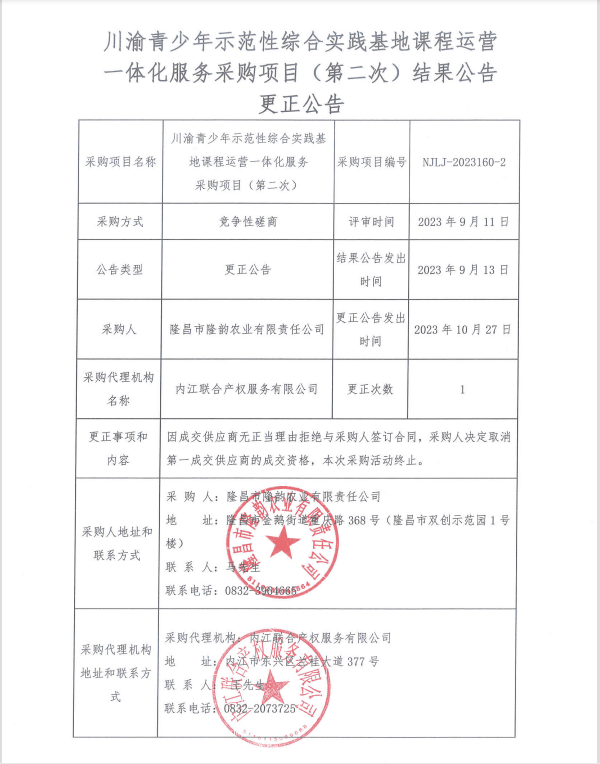 川渝青少年示范性綜合實踐基地課程運營一體化服務(wù)采購項目(第二次)結(jié)果公告更正公告