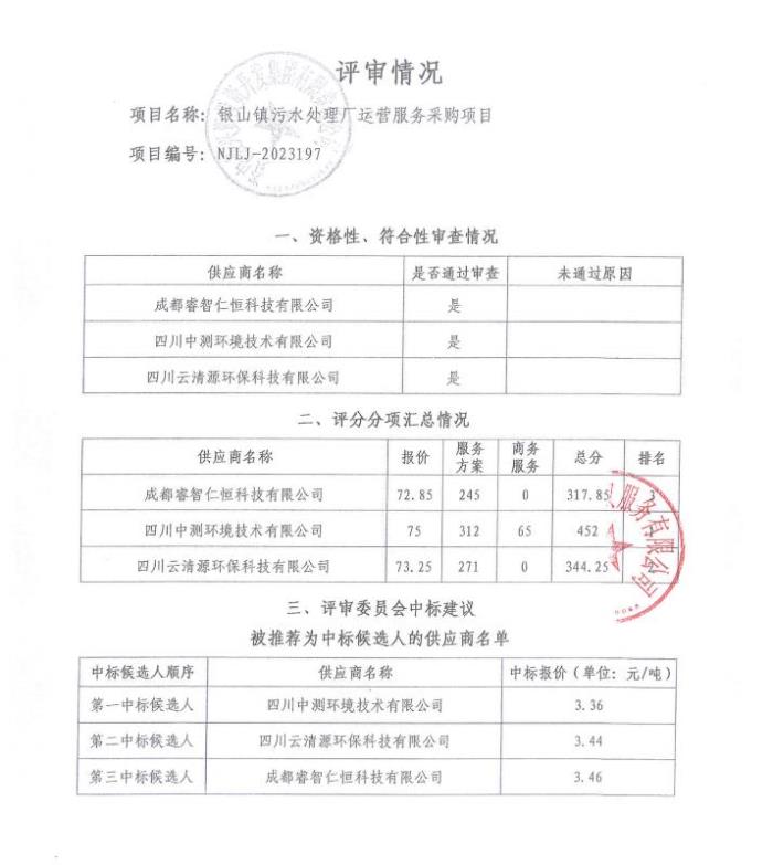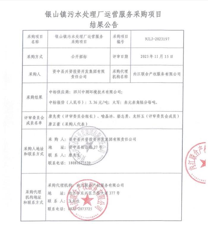 銀山鎮(zhèn)污水處理廠運營服務采購項目結(jié)果公告