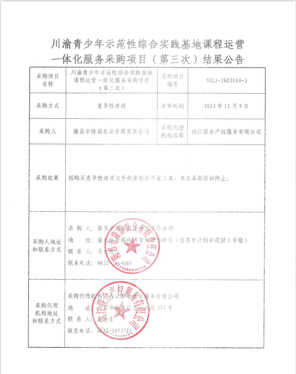 川渝青少年示范性綜合實(shí)踐基地課程運(yùn)營一體化服務(wù)采購項(xiàng)目(第三次)結(jié)果公告