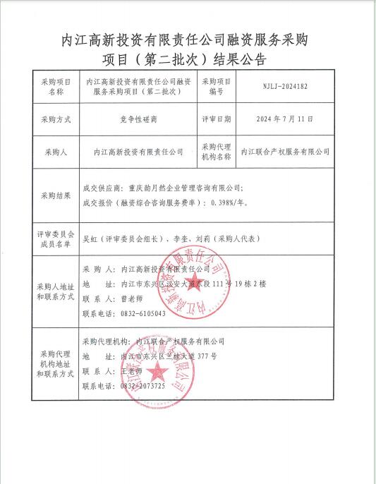 內(nèi)江高新投資有限責(zé)任公司融資服務(wù)采購項目(第二批次)結(jié)果公告
