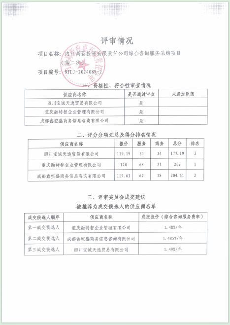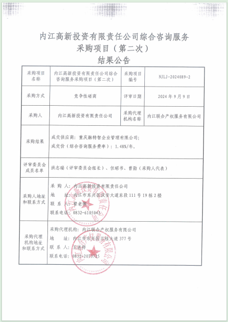 內(nèi)江高新投資有限責(zé)任公司綜合咨詢服務(wù)采購項目(第二次)結(jié)果公告