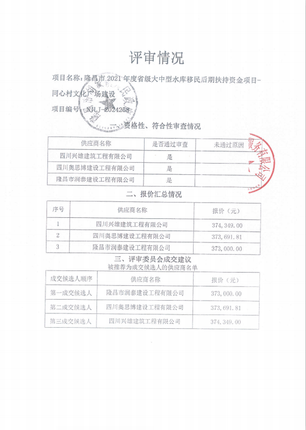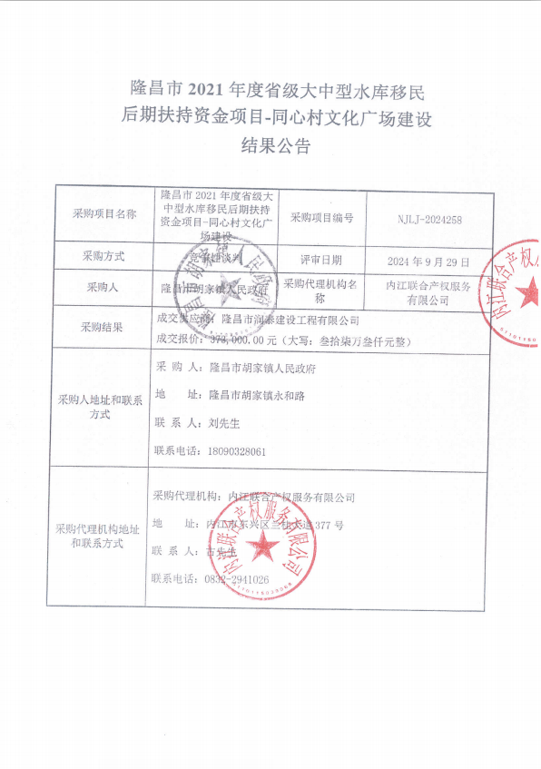 隆昌市2021年度省級(jí)大中型水庫移民后期扶持資金項(xiàng)目-同心村文化廣場(chǎng)建設(shè)結(jié)果公告