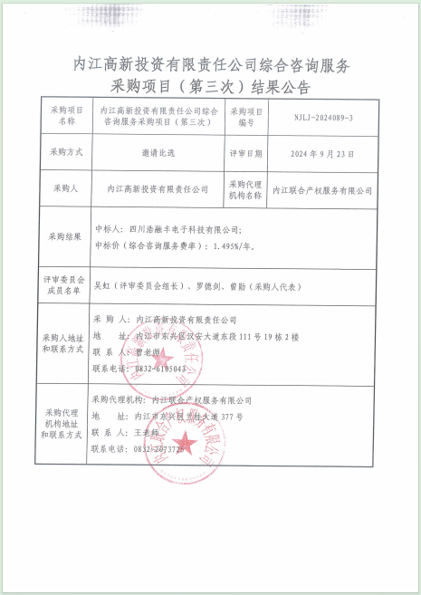 內(nèi)江高新投資有限責(zé)任公司綜合咨詢服務(wù)采購(gòu)項(xiàng)目(第三次)結(jié)果公告