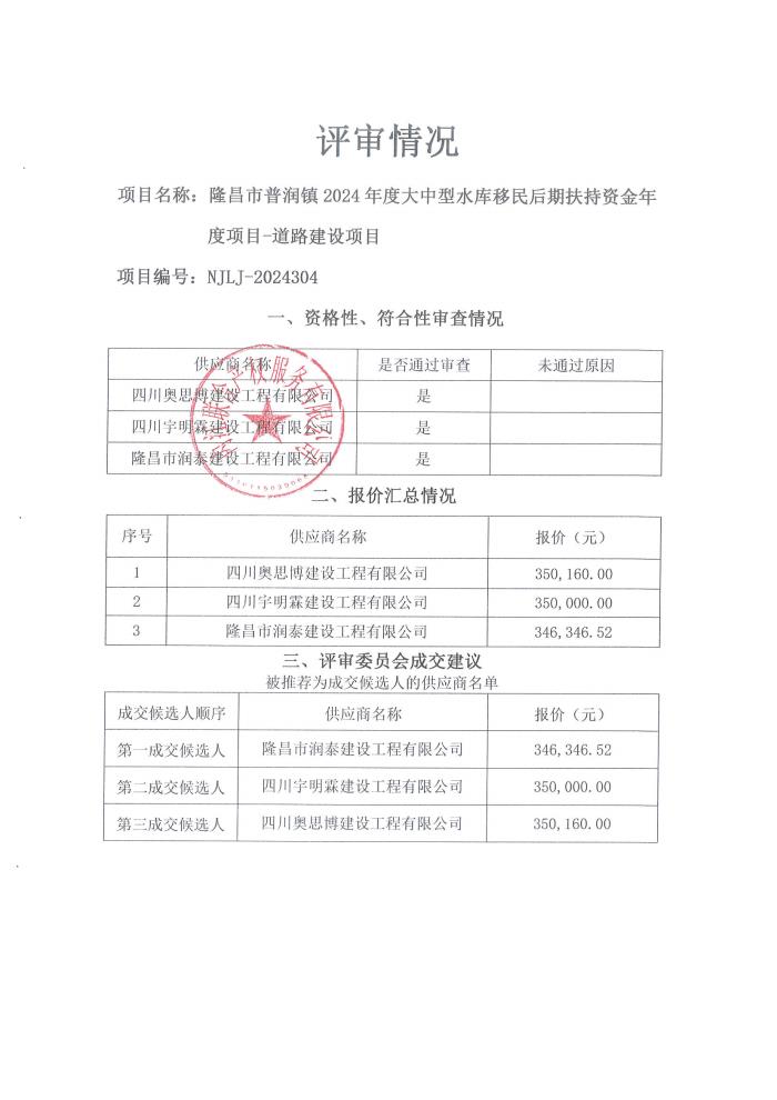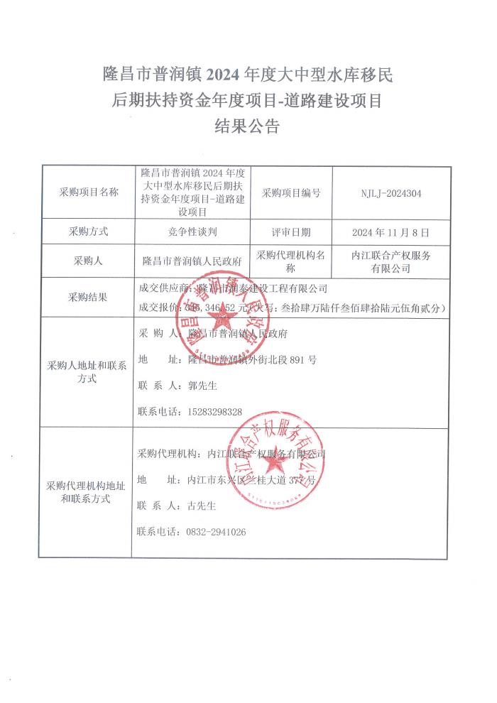 隆昌市普潤鎮(zhèn)2024年度大中型水庫移民后期扶持資金年度項目-道路建設(shè)項目結(jié)果公告