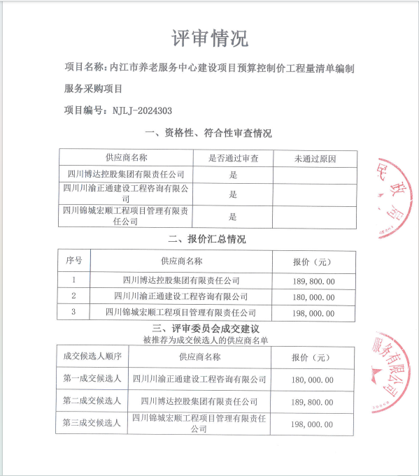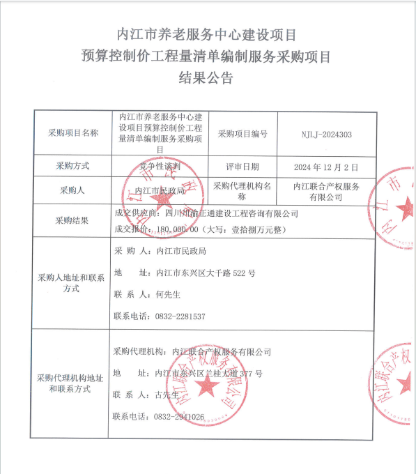 內(nèi)江市養(yǎng)老服務(wù)中心建設(shè)項(xiàng)目預(yù)算控制價(jià)工程量清單編制服務(wù)采購項(xiàng)目結(jié)果公告