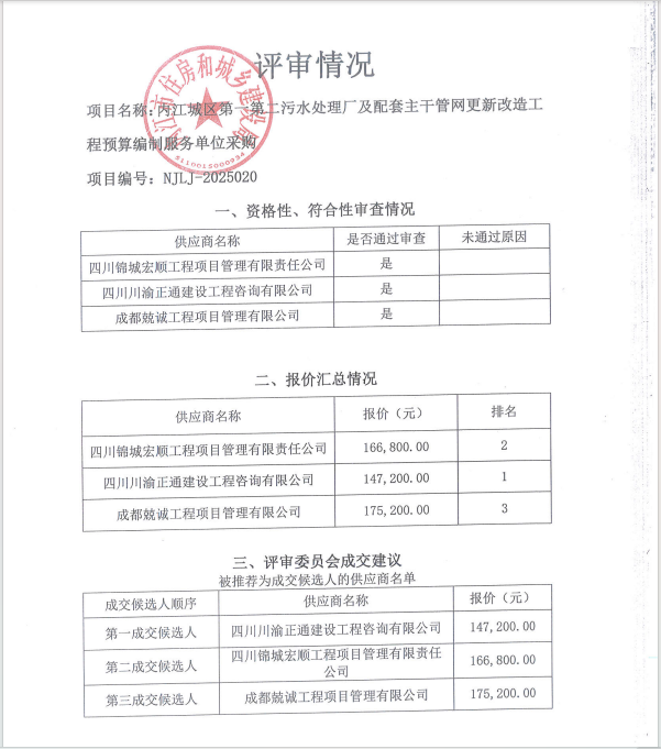 內(nèi)江城區(qū)第一第二污水處理廠及配套主干管網(wǎng)更新改造工程預(yù)算編制服務(wù)單位采購結(jié)果公告