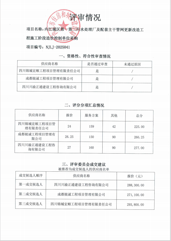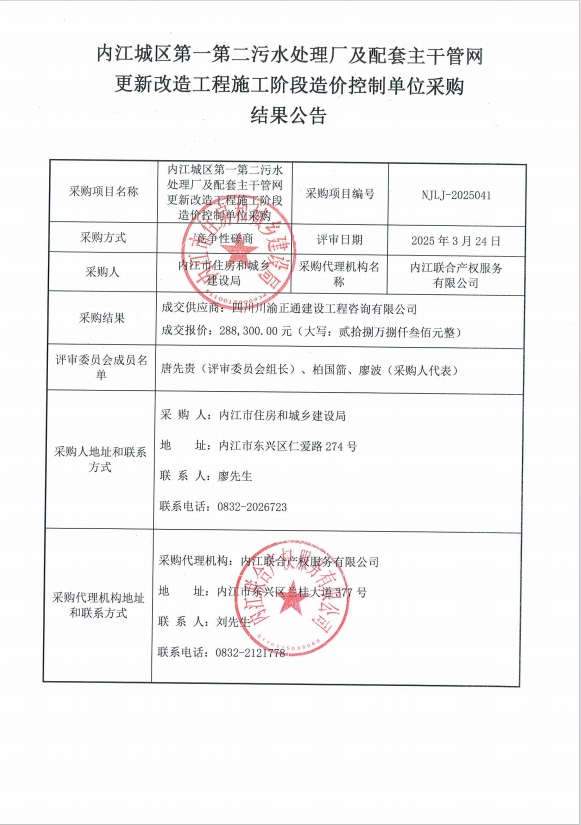 內(nèi)江城區(qū)第一第二污水處理廠及配套主干管網(wǎng)更新改造工程施工階段造價控制單位采購結(jié)果公告