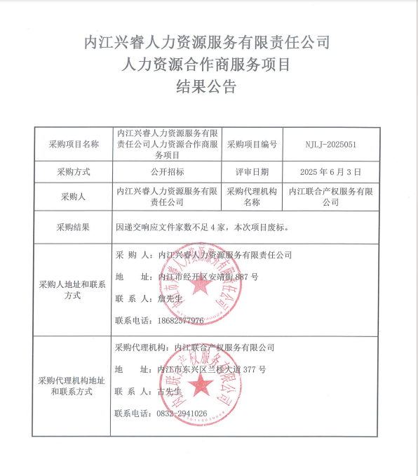 內(nèi)江興睿人力資源服務(wù)有限責(zé)任公司人力資源合作商服務(wù)項(xiàng)目結(jié)果公告
