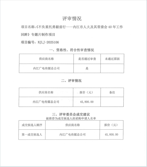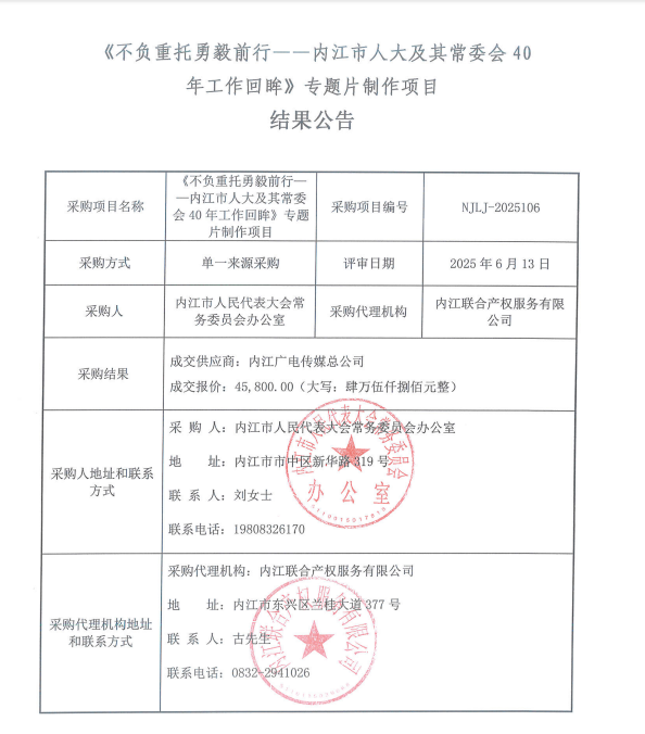《不負(fù)重托勇毅前行——內(nèi)江市人大及其常委會40年工作回眸》專題片制作項目結(jié)果公告