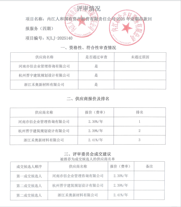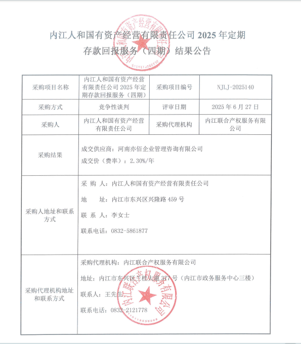 內(nèi)江人和國有資產(chǎn)經(jīng)營有限責(zé)任公司2025年定期存款回報服務(wù)(四期)結(jié)果公告