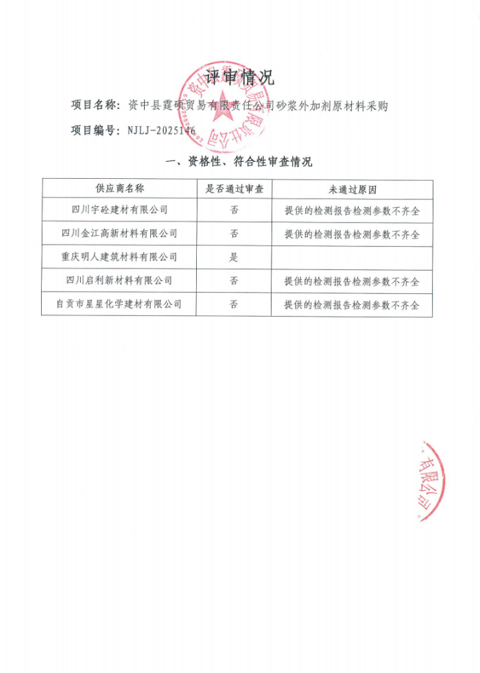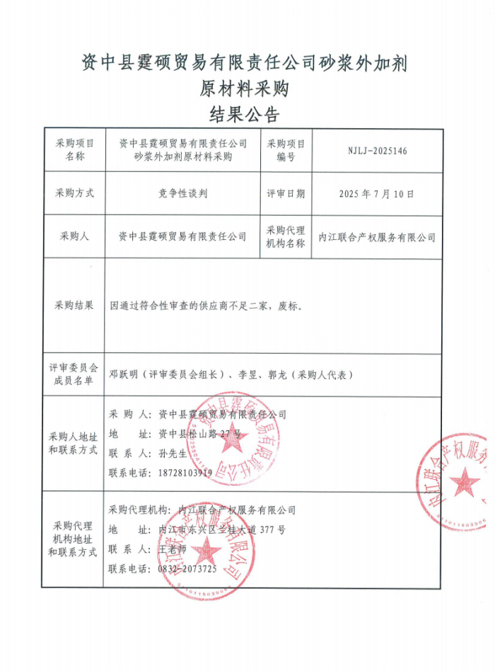 資中縣霆碩貿(mào)易有限責(zé)任公司砂漿外加劑原材料采購結(jié)果公告