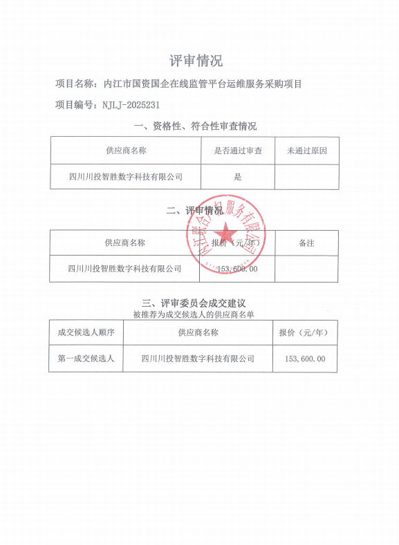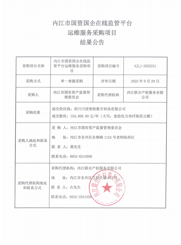 內江市國資國企在線監(jiān)管平臺運維服務采購項目結果公告
